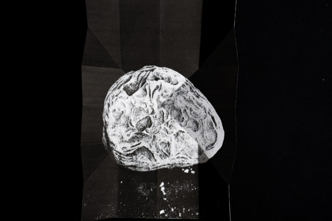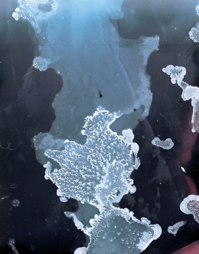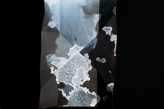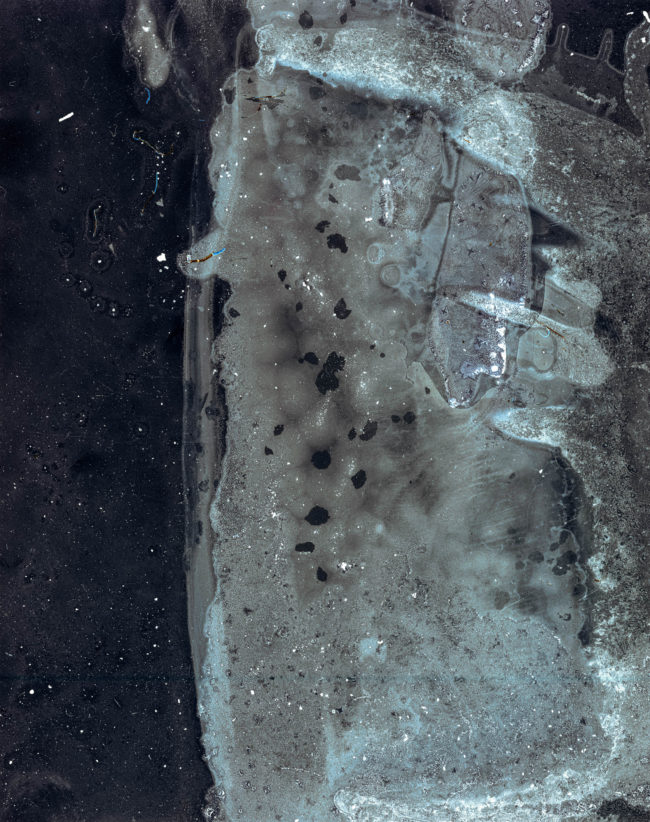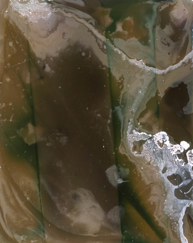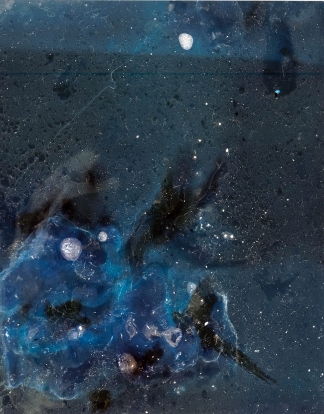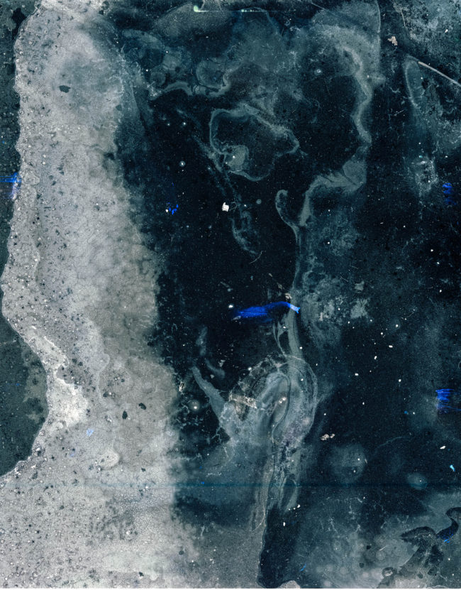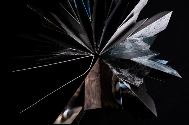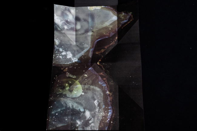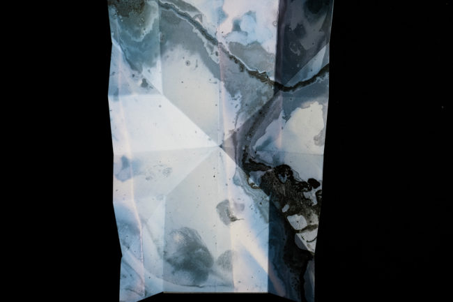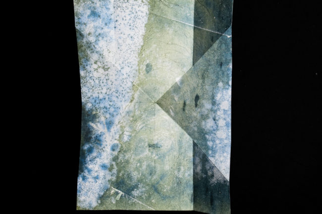 Presented as a sculptural ‘map’, the piece unfolds revealing and obscuring fragmented imagery that continuously shifts as the viewer moves through it, much in the way that both the physical seascape is in constant flux and time folds in on itself within the mind’s eye, creating new touchpoints and an ever-changing temporal space. Creating a transitional space where past, present and future can co-exist, the ‘map’ does not unfold to flatten and reveal the contours of the landscape or enable the viewer to find their way but instead enables a glimpse into the evolving mindscape, where it is impossible to ground yourself and where time loses its linear perspective, enabling the viewer to immerse themselves, not in the sea itself, but in the memory of the seascape.
